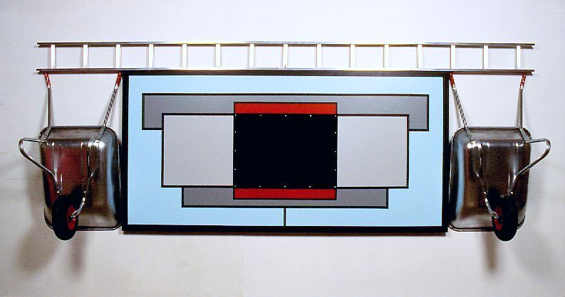maalattu puu, alumiini, kottikärryt, 143 x 366 x 55 cm